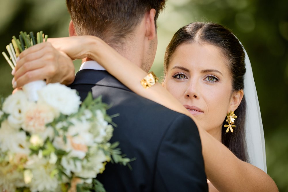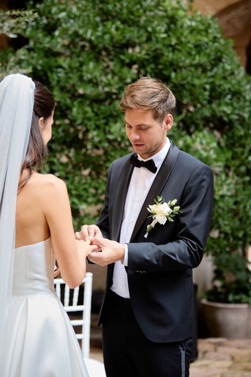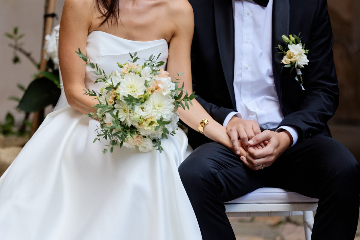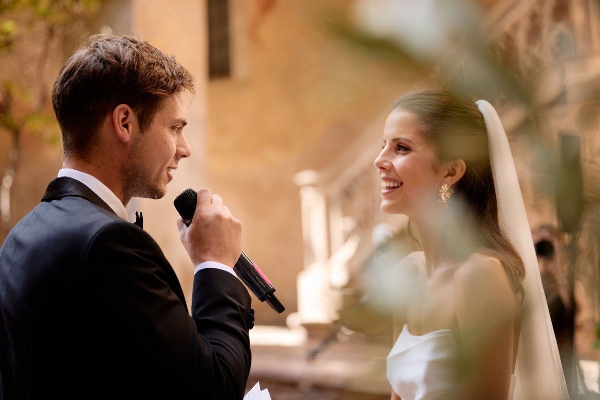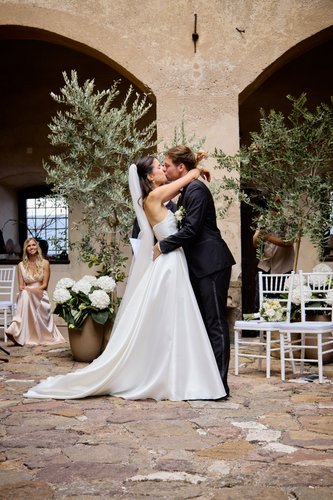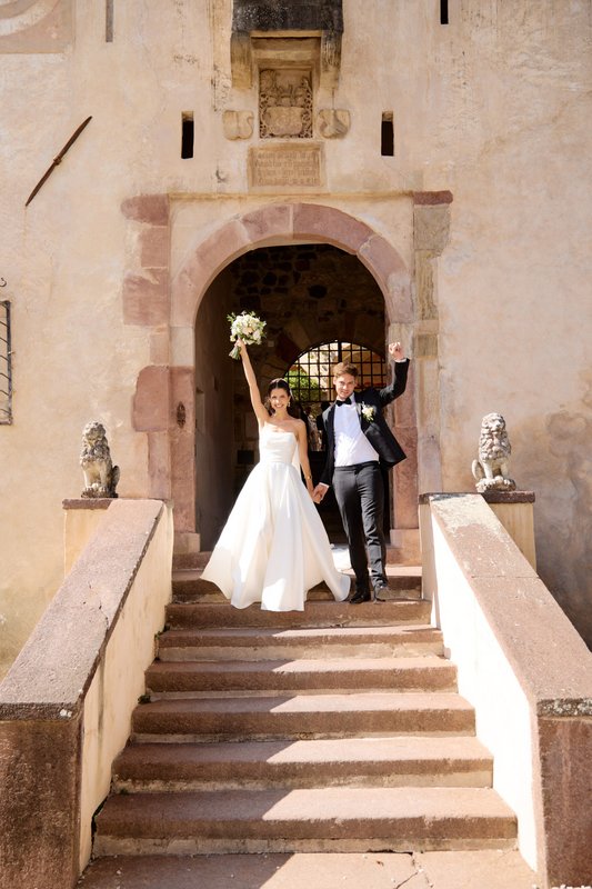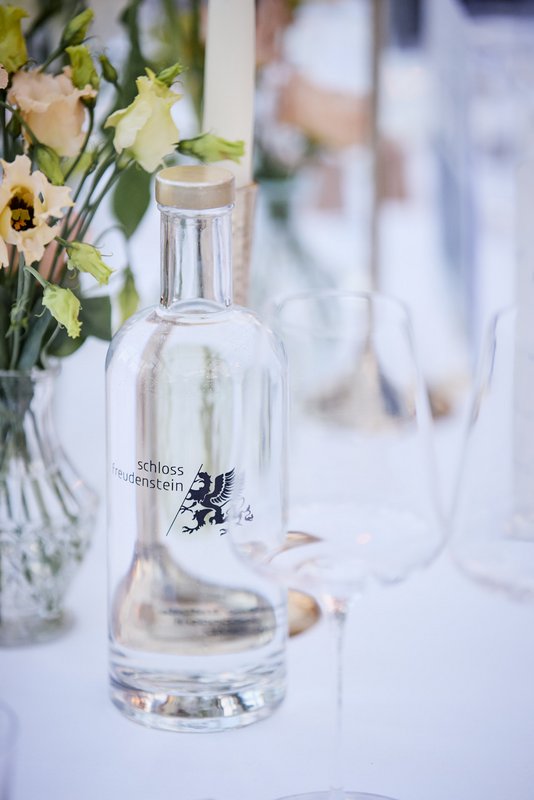 Der Hochzeitsmorgen begann stilvoll und mit prickelnder Vorfreude hinter den dicken Mauern von Schloss Freudenstein, die von vergangenen Tagen erzählen. Nach ihren Vorbereitungen hat sich das Brautpaar beim First Look das erstemal zu zweit getroffen. Anschließend war gemütlich Zeit für Paarfotos im und um das Schloss Freudenstein: in der Allee und in den Weinbergen, im Olivengarten und im wunderschönen Blauen Saal. Die persönliche und emotionale evangelische Trauungszeremonie fand unter freiem Himmel im Innenhof des Schlosses statt.