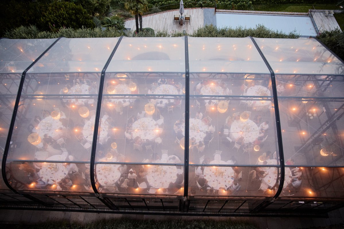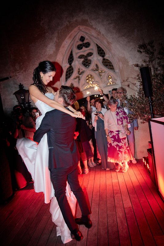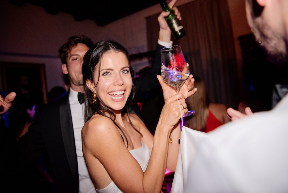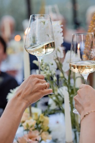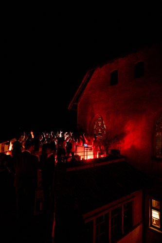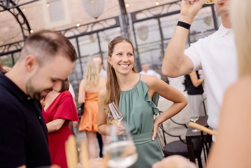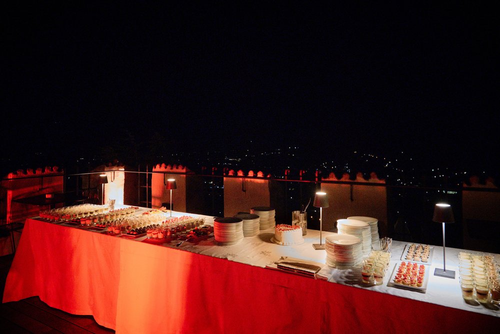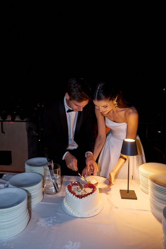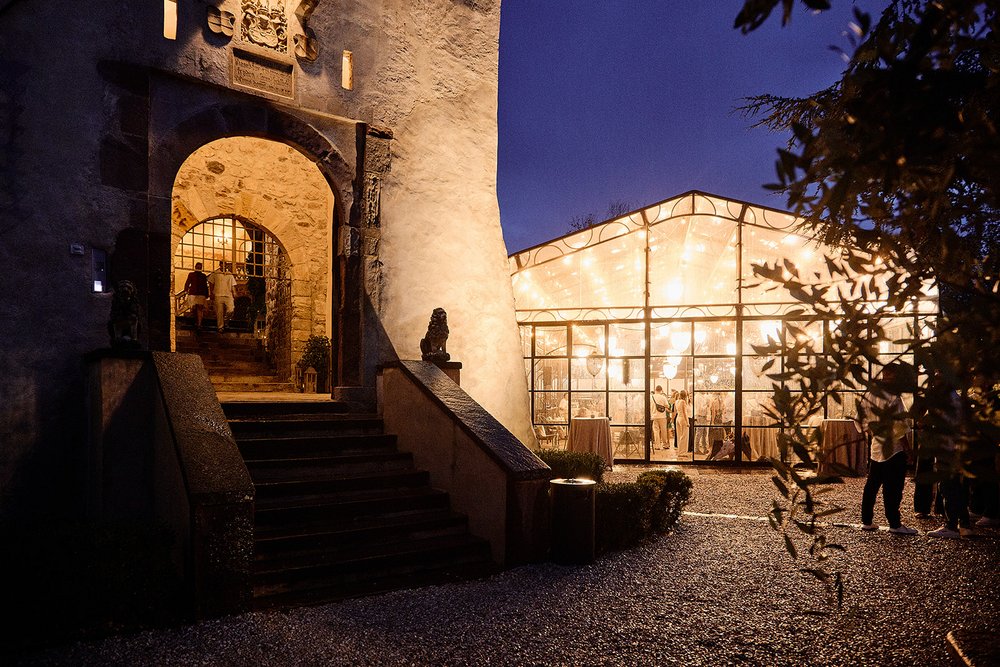 Nach einem exklusiven Hochzeits-Dinner in der Orangerie gab es den Tortenanschnitt unterm nächtlichen Himmel auf der Dachterrasse des Schlosses. Hier wurde auch genossen und gefeiert, der eine oder andere Espresso Martini getrunken und getanzt, während sich die Nacht übers Land legte und die Sterne mit den Lichtern tief unten im Tal um die Wette funkelten.